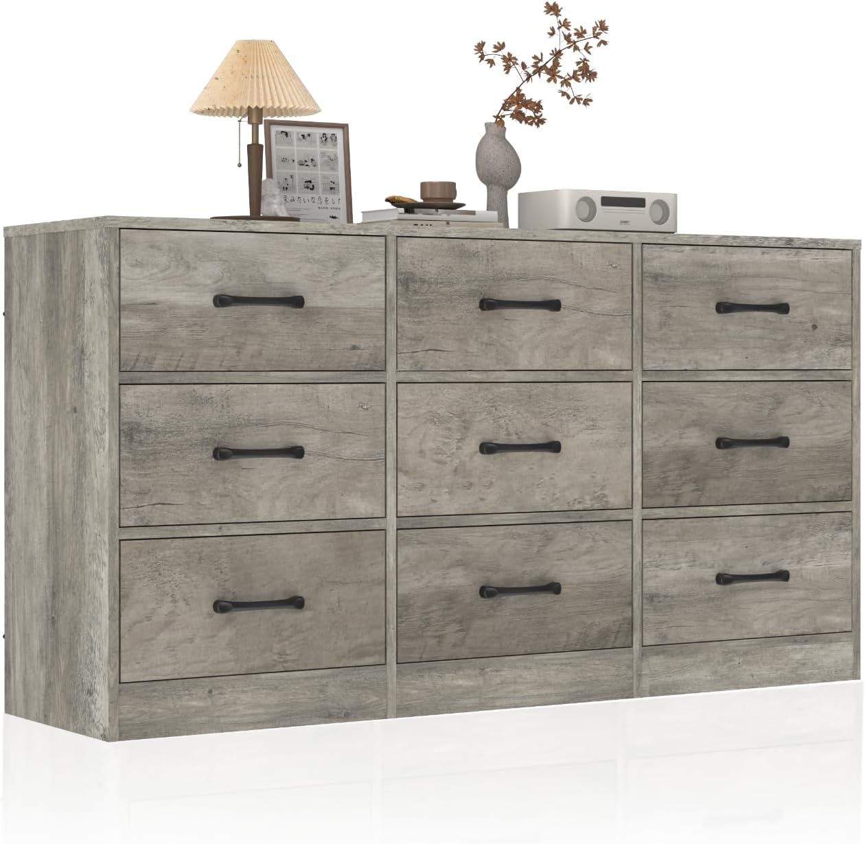 Coewske 9 Drawer Dresser 50'' Wood Dresser Chests of Drawers for Bedroom w/ Fabric Drawers Gray