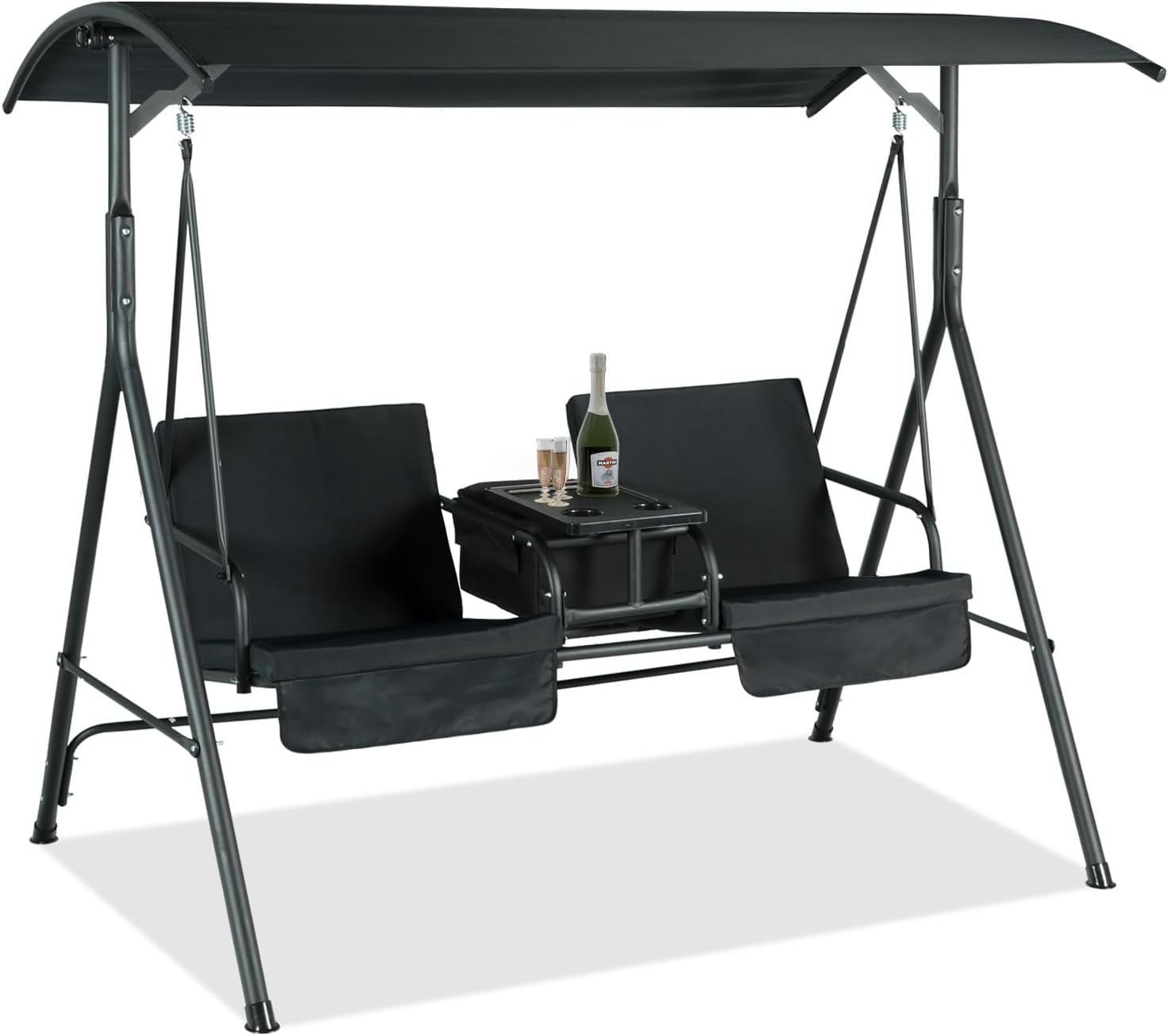 - SWING CHAIR WITH COOLER BAG: Our upgraded patio swing chair features a concealed cooler bag and turntable panel cup holders. Even during scorching summers, you can keep your drinks chilled and conveniently accessible while enjoying the shade under our canopy swing. The cooler bag also provides storage space for fresh fruits and food. Additionally, the mid-table offers extra surfaces to hold those ice-cold refreshments. Unwind alone or with loved ones and alleviate stress from daily life.