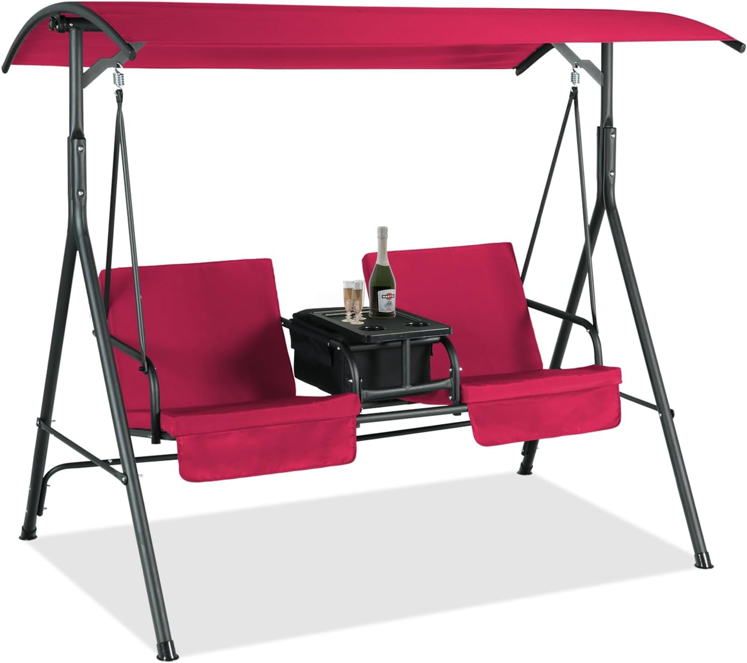 Coewske Cushioned Patio Porch Swing Chair Glider w/ Cooler Bag & Adjustable Canopy Wine Red