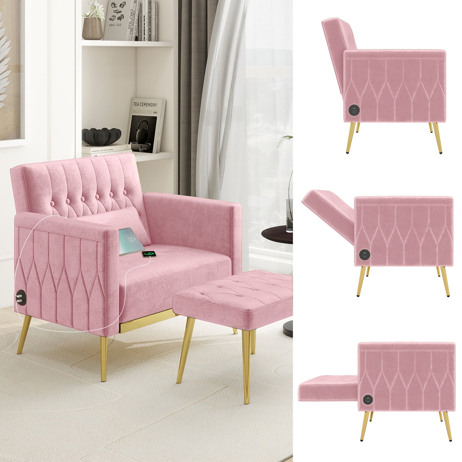 - Customizable Backrest Positions: Our armchair with ottoman offers three adjustable angles (105°, 120°, 180°) for the backrest, ensuring you find the perfect position for optimal relaxation. The 105° angle is ideal for activities like sipping coffee, reading, or working. At 120°, you can comfortably watch TV and play games. And when you or your friend need some rest, the recliner chair can even transform into a flat 180° single bed. Design with USB Charging Ports: We have added two USB charging ports on one side of the armrest, allowing you to effortlessly charge your iPad or phone while enjoying the comfort of our accent chair with ottoman. Whether you are playing games, watching TV, or chatting online with friends, this feature provides a convenient and continuous power supply. Unparalleled Comfort: Featuring a 7.87-inch seat cushion wrapped in springs and resilient sponge, our comfortable chair guarantees long-lasting support without sagging. The small pillow adds lumbar support, contributing to an ergonomically designed reading chair. Additionally, the ottoman offers additional seating options for your friends.