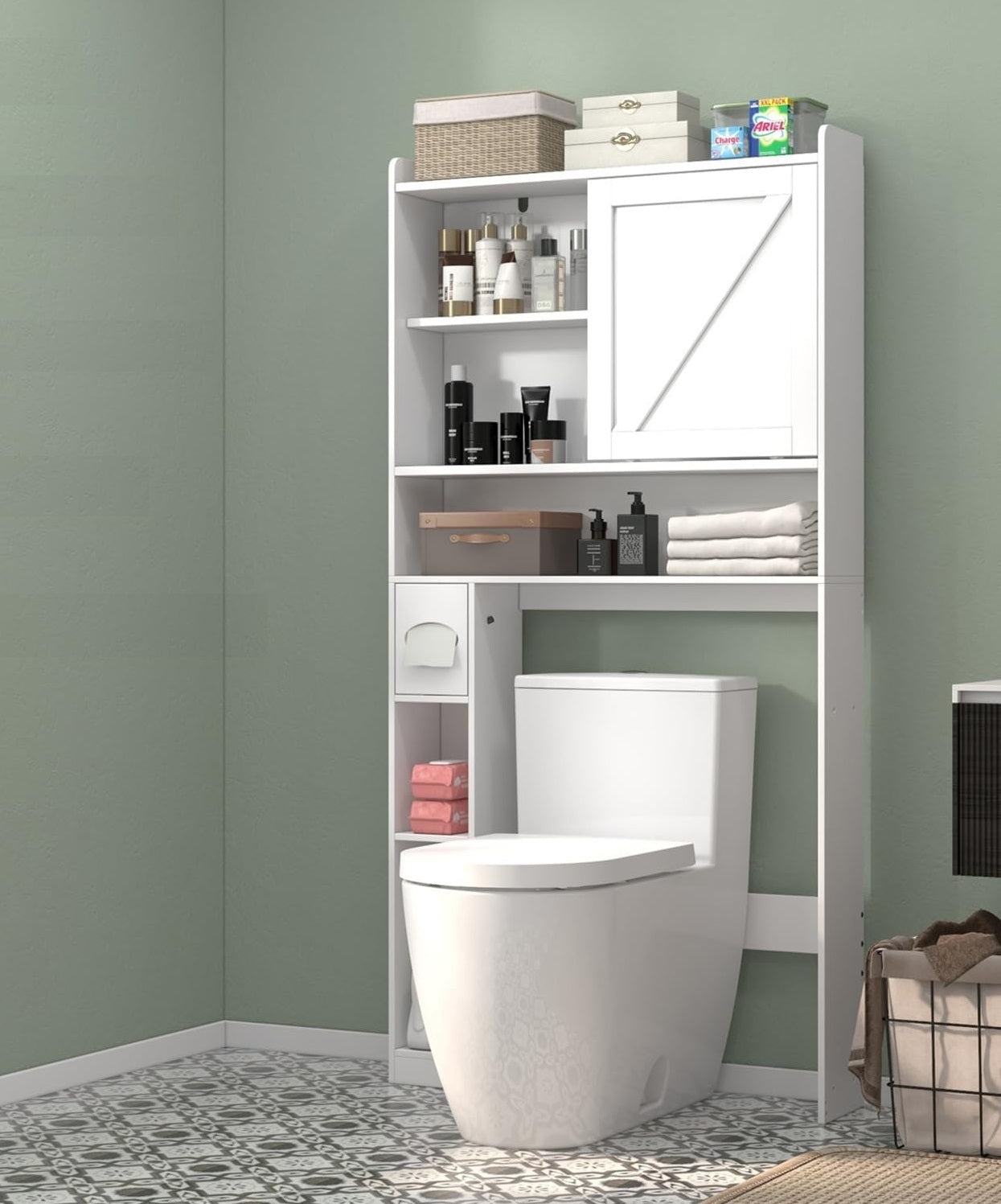 This farmhouse-style over toilet cabinet is the perfect addition to your bathroom or laundry room, providing both style and functionality. The sliding barn doors not only add a touch of rustic charm but also make accessing your stored items a breeze. With a built-in paper holder stand, you can keep your toilet paper conveniently organized and within reach. This home space-saving toilet rack is designed to fit securely over standard toilets, maximizing your vertical storage space. Made from durable materials, this cabinet is built to withstand daily use and is easy to clean, ensuring long-lasting functionality and style. Upgrade your bathroom or laundry room storage with our storage cabinet today!