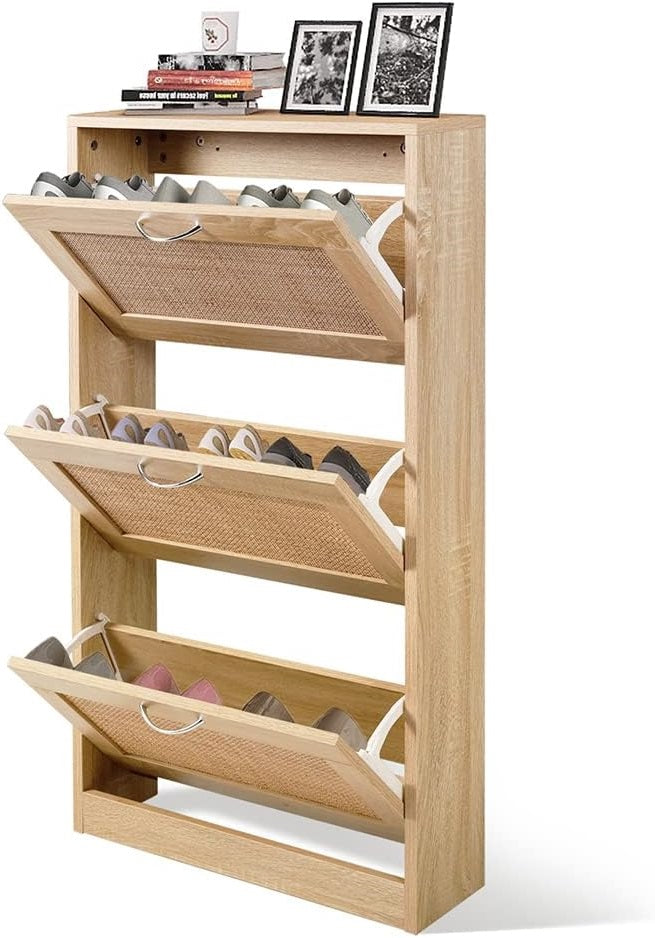 Coewske Slim 3 Tier Entryway Shoe Cabinet Narrow Wooden Storage Shoe Rack w/ 3 Flip Drawers
