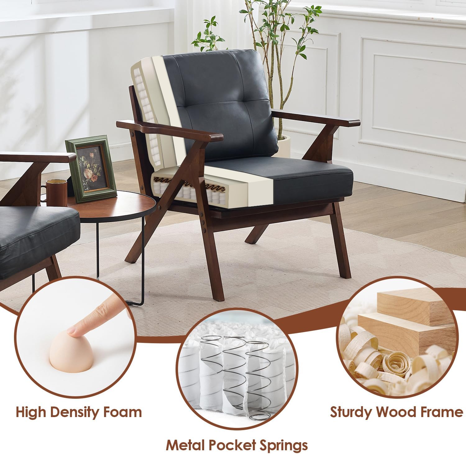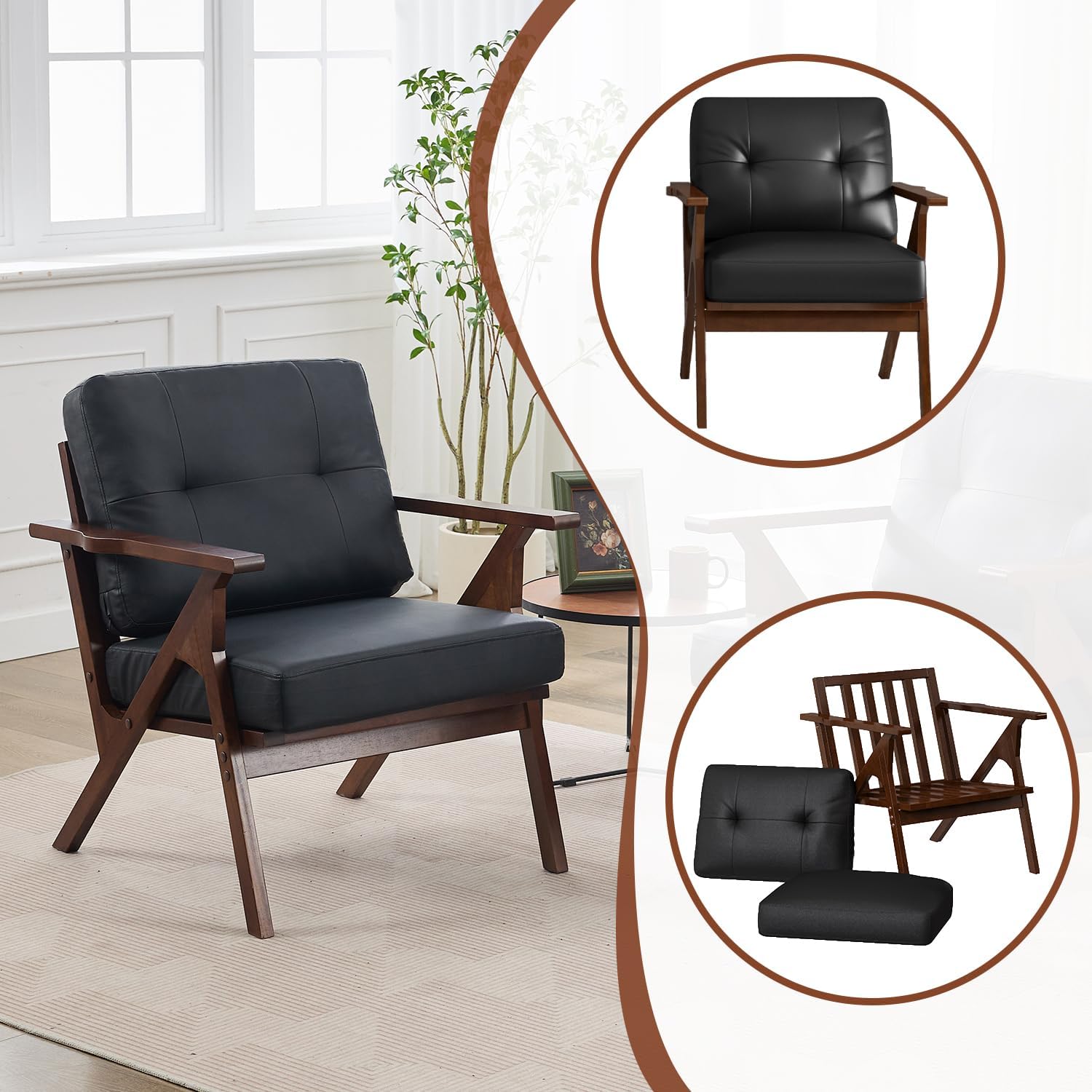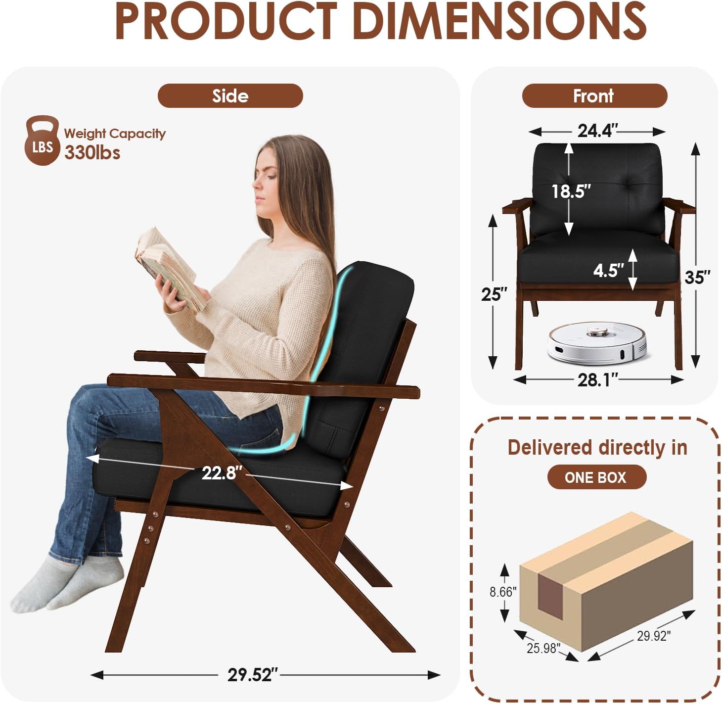 - Mid Century Modern Design: Our modern chair has a simple and stylish appearance with clean lines. Featuring black leather paired with a red brown wooden frame, the stylish design of the tufted buttons on the backrest complements all styles. This chair is an ideal choice for living rooms, bedrooms, waiting rooms, offices, and more