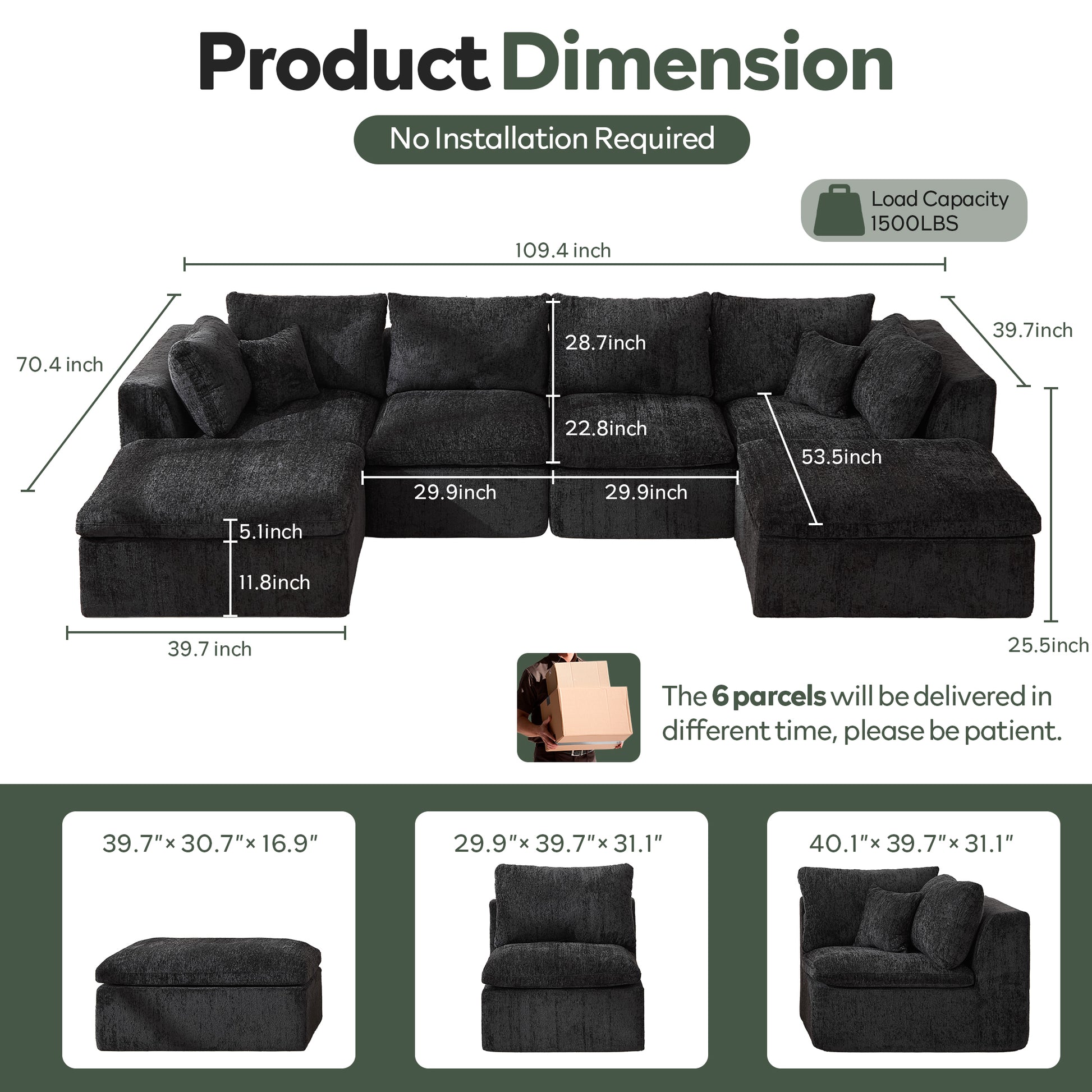 STHOUYN 145” Modern Black U Shape Sectional Couches for Living Room, Black Modular Cloud Sofa Boneless Couch with Ottoman, Comfy Big Oversized Corner Couch (Black, 4 Seater + 2 Ottoman)