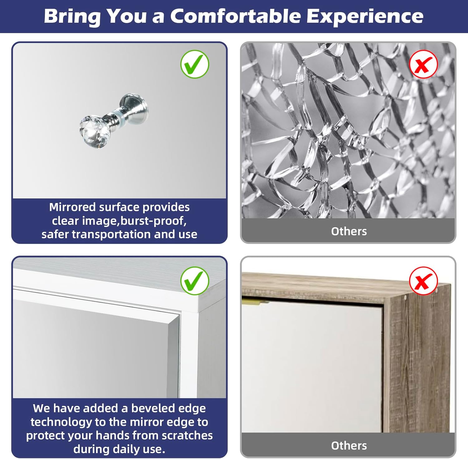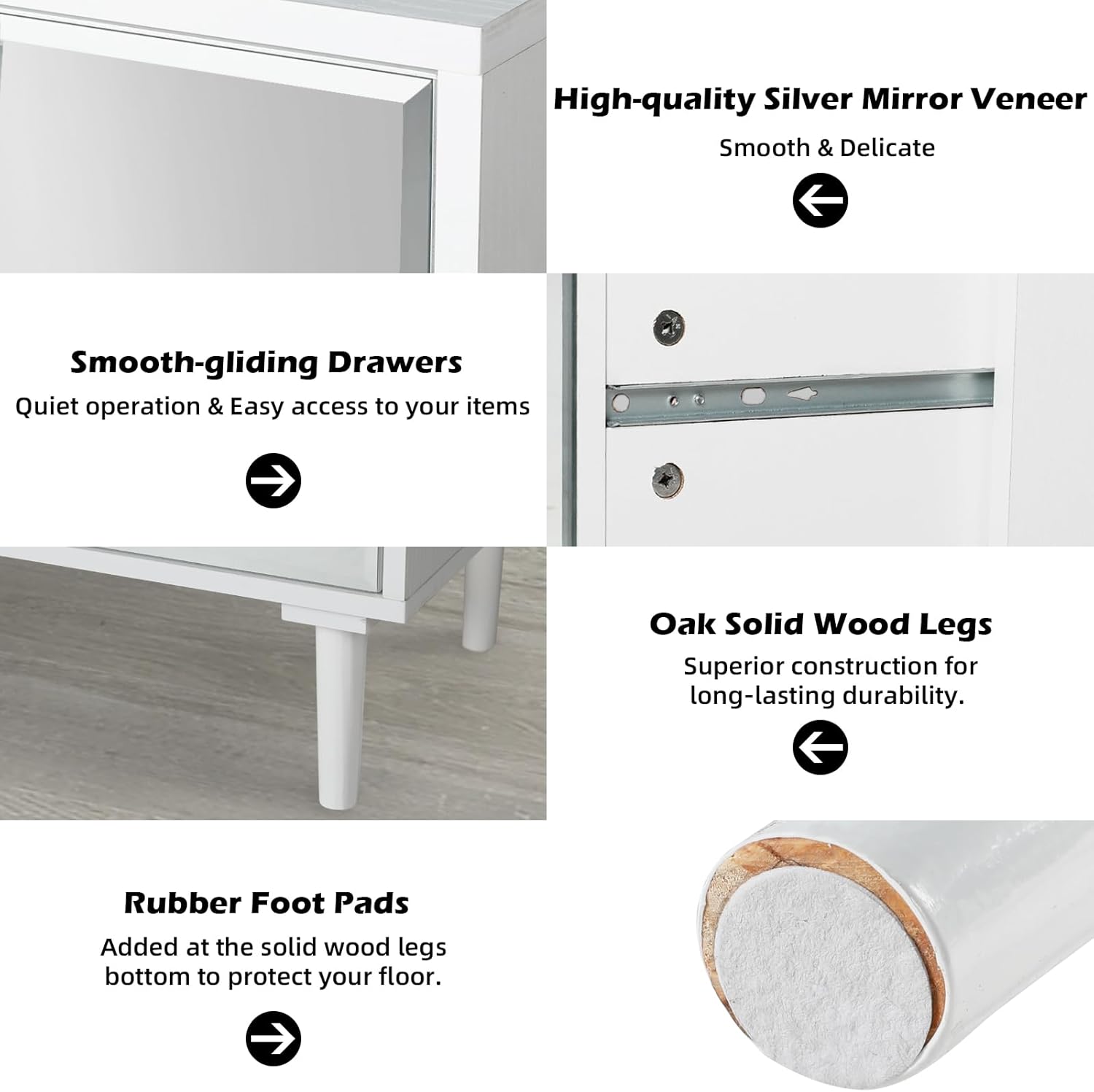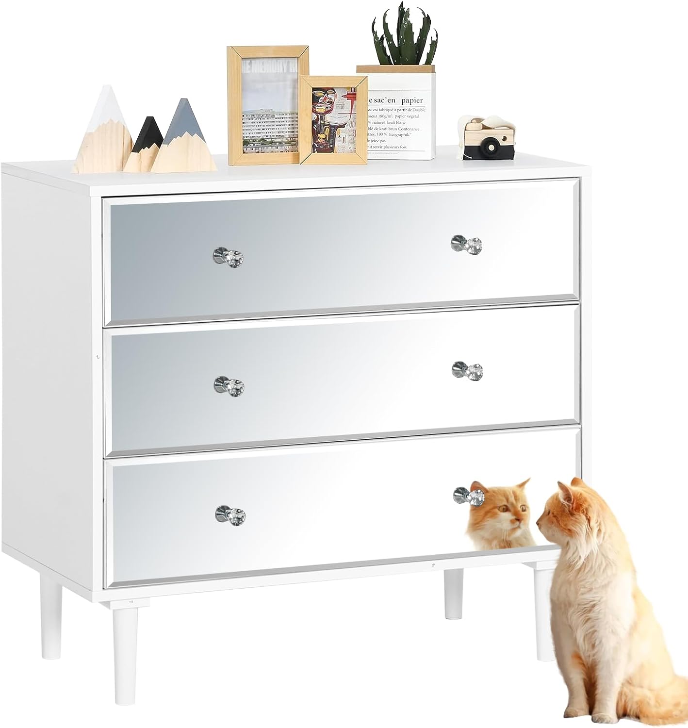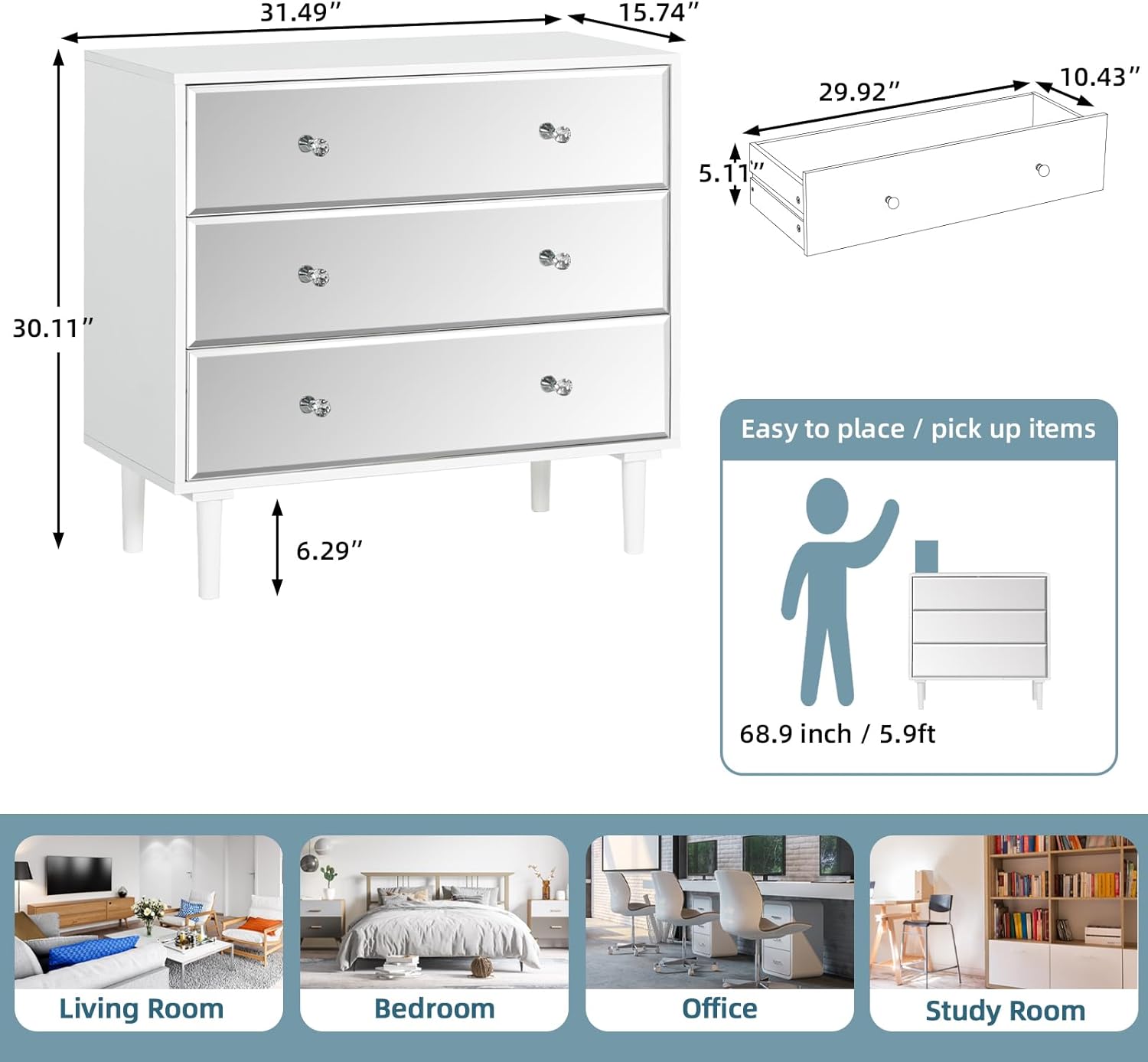 - 【Safe Design】We have added a beveled edge technology to the mirror edge of the chest dresser to protect your hands from scratches during daily use. And it has undergone explosion-proof treatment, so it will not be damaged during transportation. Very safe for daily use.