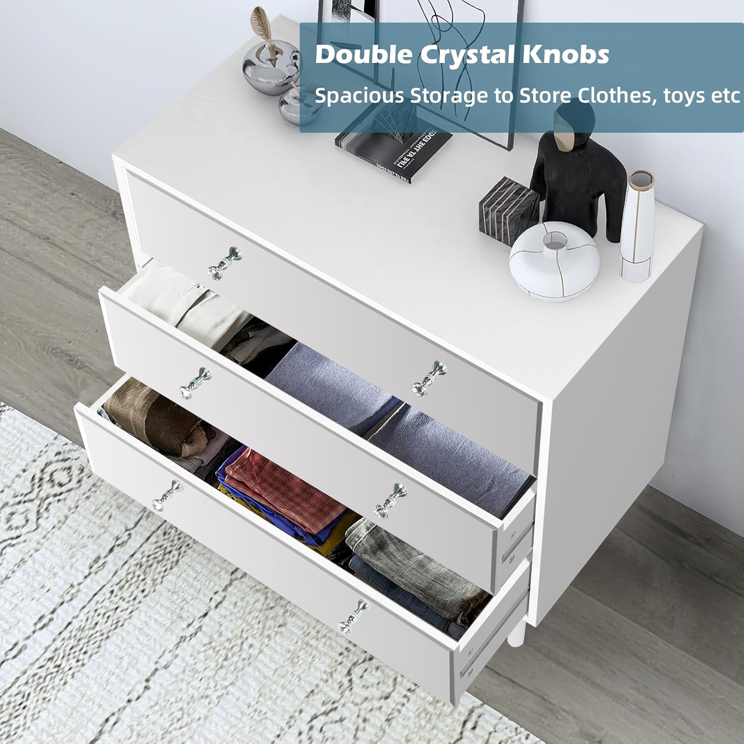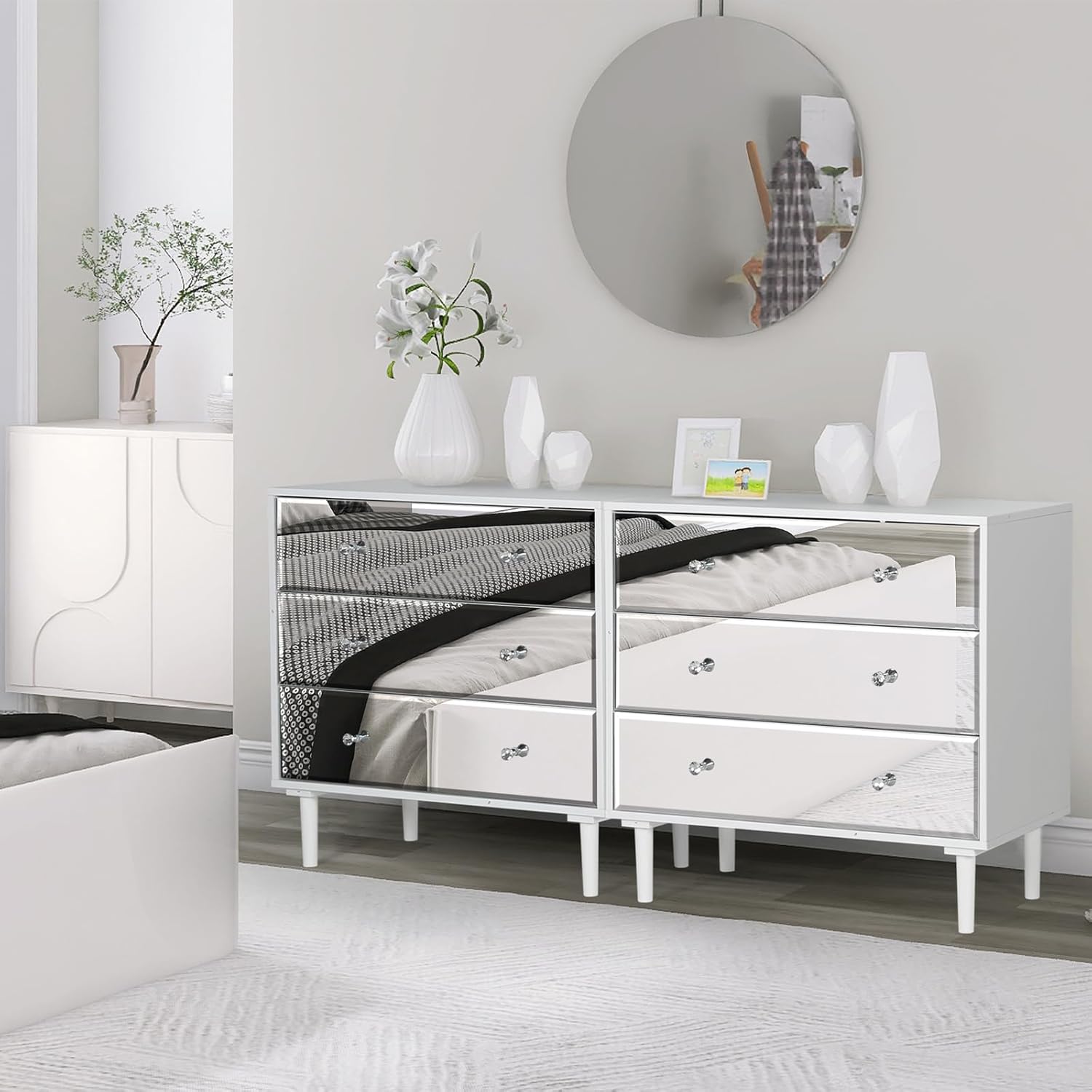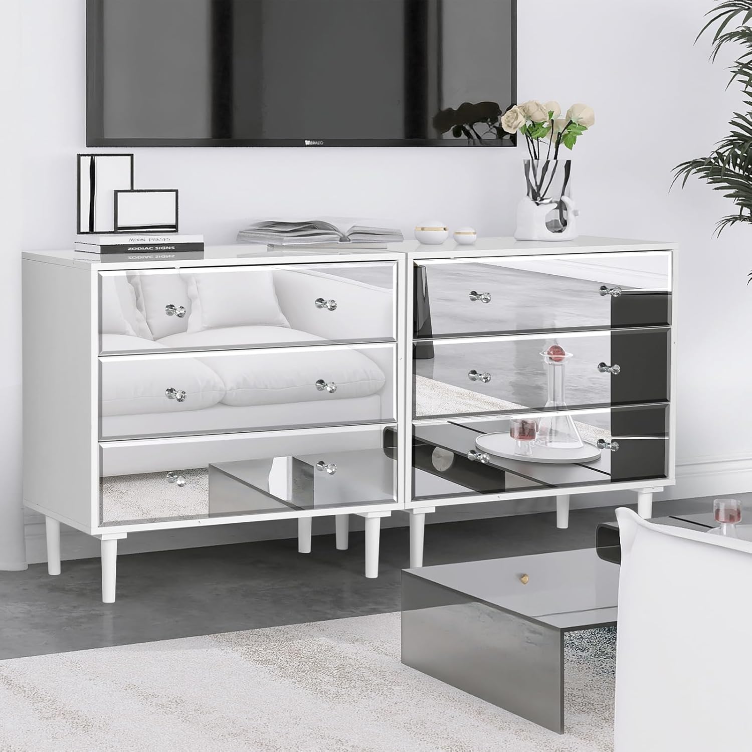 - 【Modern Simple Style】The chest of drawers body is made of white with light wood grain, and the 3 drawer dresser door panel is designed with high-quality silver mirror veneer. Easy cleaning and keeping in a brand new state forever. Adopting high-end crystal handles, retro and luxury. The mirror design providing soft light and atmosphere. STHOUYN offers a complete set of mirrored furniture, sofa tables, and nightstand.
