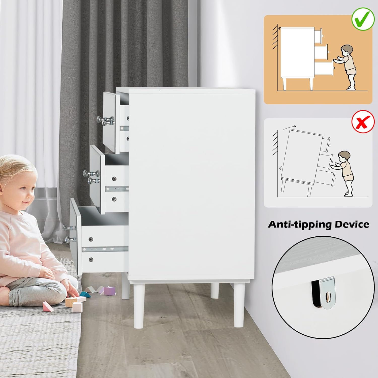 - 【Multifunctional Dresser & Assembly】The wooden chest dresser can be used as a perfect wood storage chest for your bedroom, entryway, closet, hallway or as a TV stand for the living room. Also you can use it as nursery dresser. We provide clear instructions and label all spare parts and you will finish it within 15 minutes. We offer 1 month's free return and 1 year's free new replacement service (If there are any issues with the white dresser)