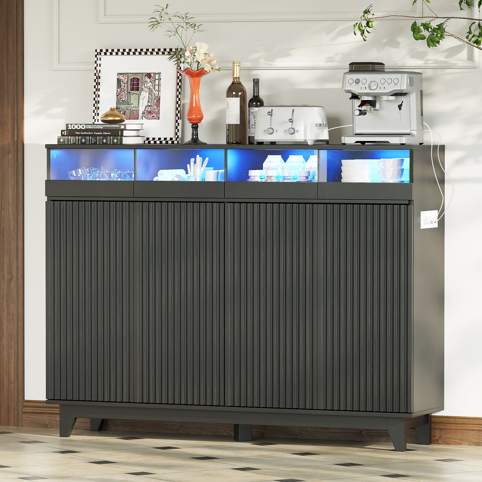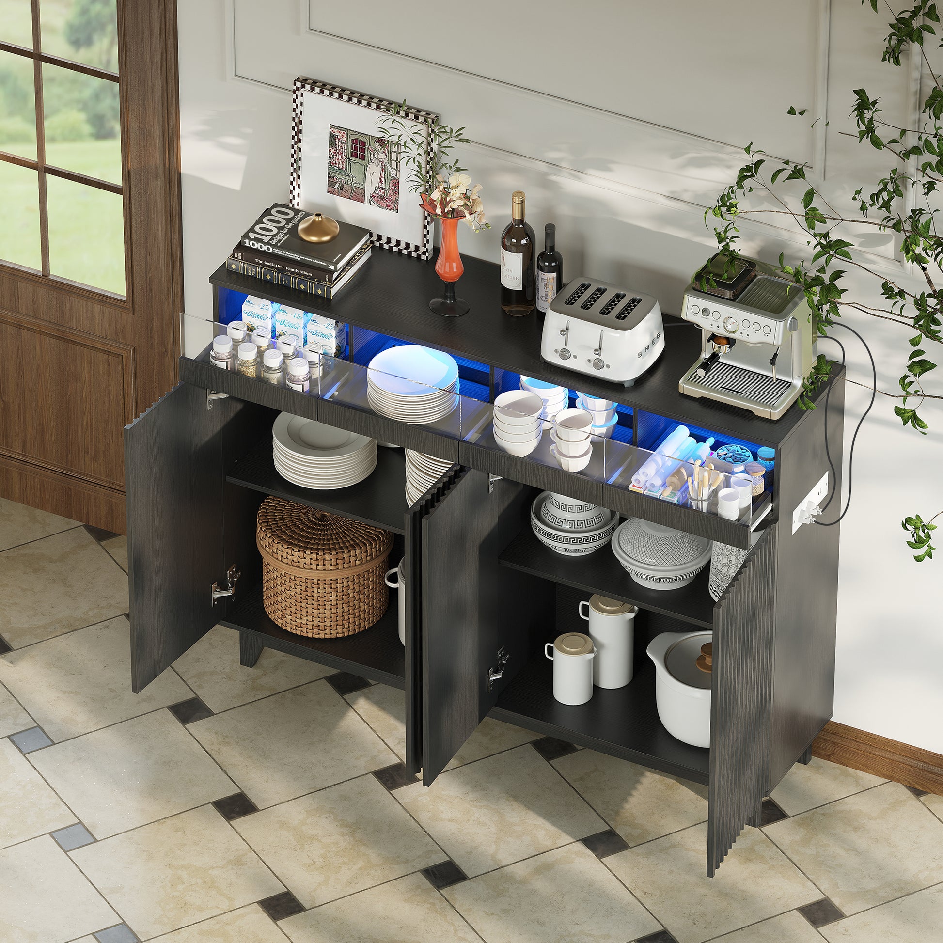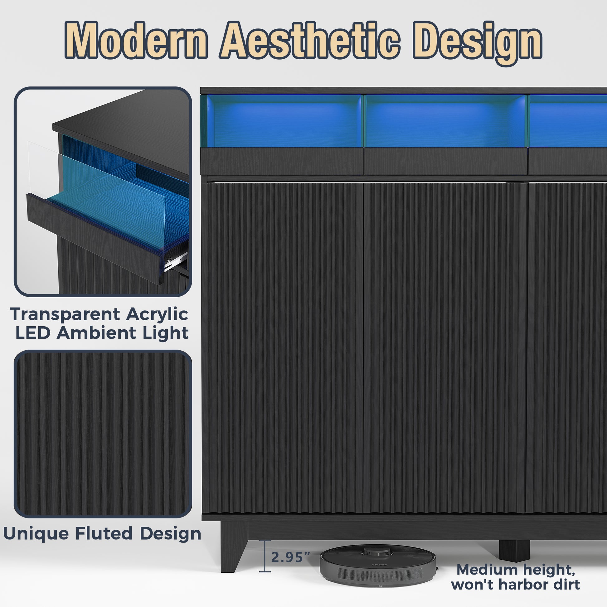 STHOUYN 55" Sideboard Buffet Cabinet with Charging Station LED Lights, Side Board Credenza Storage Cabinet, Modren Kitchen Buffet Table with Drawers, Wood Dining Room Sideboards (Black)