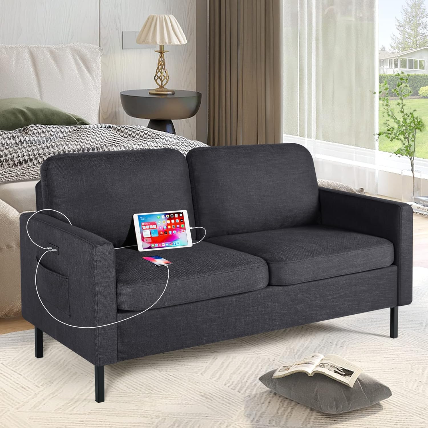 STHOUYN 56" W Fabric Love Seat Couches w/2 USB, Small Couches for Small Spaces w/ 2 Side Pocket, 2 Seat Loveseat Mini Couch for Office, Dorm, Bedroom